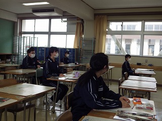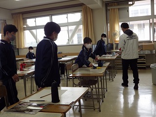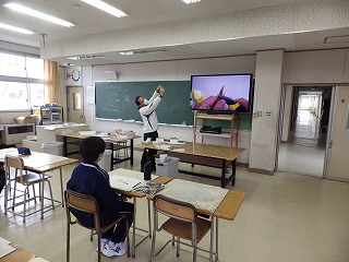1年2組の美術の授業です。デッサンをするために欠かせない道具である鉛筆を、使いやすく削る説明を動画を用いて説明しています。間違って使用するとけがにつながってしまうので、時間をかけて説明しています。ナイフは右用と左用に分かれており、配付後安全に気をつけながら丁寧に削っていました。