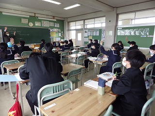 1年3組の社会の授業です。北極点と南極点を確認し、緯度と経度の説明を聞いています。教師の発問に積極的に挙手をしています。また、答えをジェスチャーで返したりと、随所に工夫が見られました。