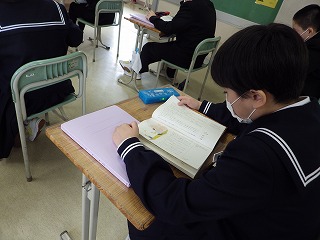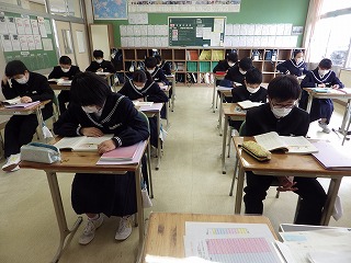 2年2組の国語の授業です。「アイスプラネット」の最初の授業なので、範読をCDで聞いています。新出漢字や難しい語句の確認をしながら、初発の感想を持とうと、特に登場人物の会話に注目しながら聞いています。ちなみに範読しているのは俳優の仲村トオルさんですが、気づいた生徒がどのぐらいいるのか気になるところです。