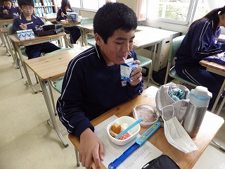 3年3組の昼食の様子です。学校で飲む久しぶりの牛乳の感想を聞くと、「大地の味がします。」と自然の恵みのありがたさを感じていることがわかるコメントが返ってきました。