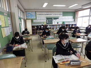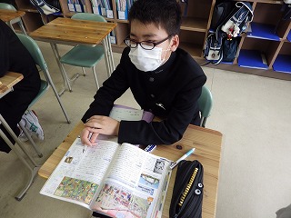 3年4組の社会の授業です。明治政府によって作られた制度についての確認をしています。現代社会と比較しての説明に、生徒も真剣に話を聞いています。