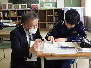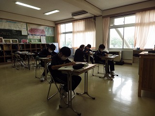 ふくやま3組の数学の授業です。いろいろな式の展開について、ワークを活用しながら真剣に取り組んでいます。それぞれの生徒の学習状況に応じた担当教員の説明もあり、集中して授業に取り組んでいます。