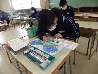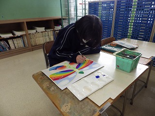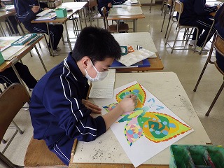 3校時の美術の授業です。蝶のデザインを自分で考えて、思い思いに作画している様子です。