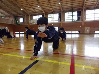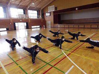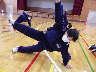 3校時の保健体育の授業です。なかなか形がきれいです。やはり体力や筋力がいるので、同じ姿勢を保とうと一生懸命に取り組んでいます。