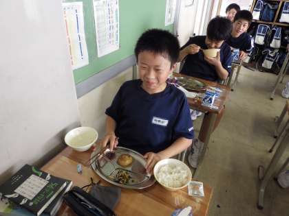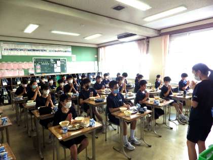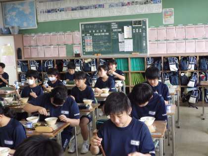1年3組の給食の様子です。今日の献立は、麦ごはん・たまごふりかけ・牛乳・チーズかまぼこのバーベキューソースかけ・韓国風のり和え・南蛮汁・ヨーグルトでした。男子生徒にインタビューすると、南蛮汁が一番おいしいとのことでした。給食についてのコメントを求めると、しばらく考えた後、「温かい。」との答えが返ってきました。暑い日が続きますが、温かいとやはりうまさも格別ですね。温かい給食を提供してくださる多くの人に感謝申し上げます。