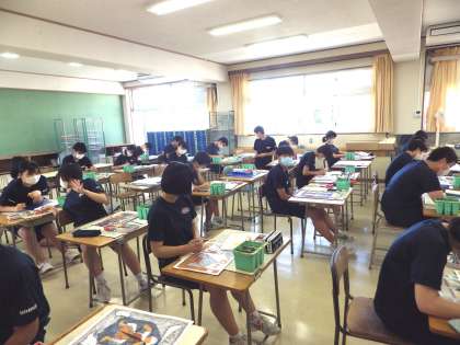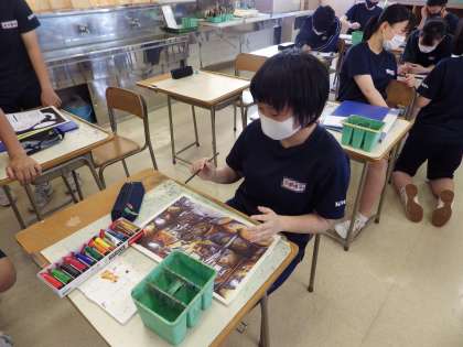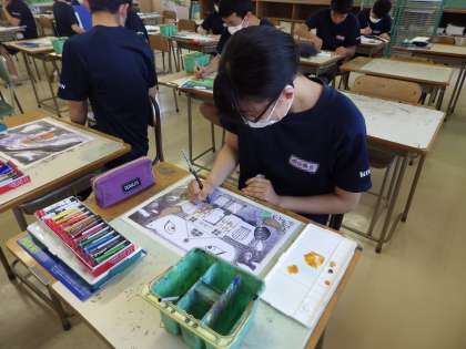 3年2組の美術の授業です。今日は彩色が中心の授業です。着色すると、下書とはかなりイメージが変わるので、どのような色合いにするのかみんな試行錯誤をしながら取り組んでいます。