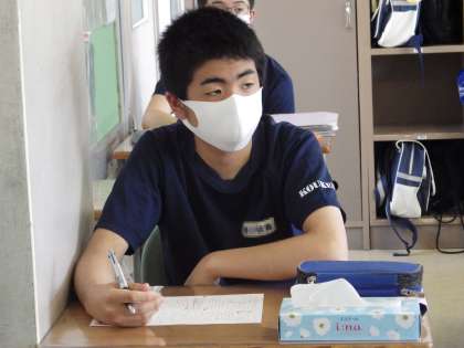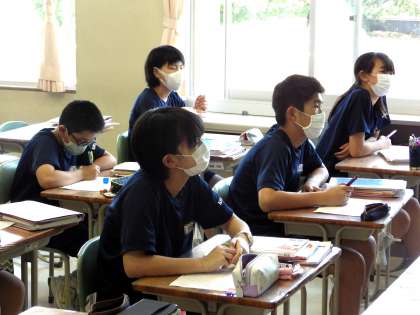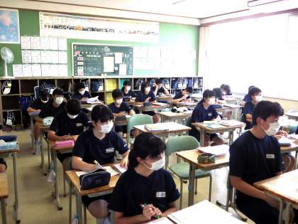 2年4組の国語の授業では、単元テストの解説を行っていました。7月7日に行われる定期テストに向けて、自分の解答が適切なのかどうか確認しています。間違ったところを赤で修正して、復習につなげようとしている生徒が多かったです。