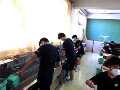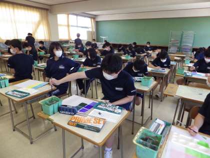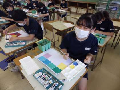 2年3組の美術の授業です。四季のイメージをデザイン化する授業が始まりました。今日はその下地になる色を染めています。一見単純作業に見えますが、完成した絵を想像しながら、バランスをよく考えて色を塗っています。