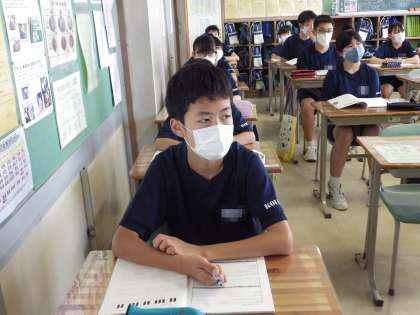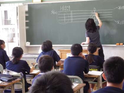1年4組の音楽の授業です。音符の読み取り方や注意事項について学習しています。普段なかなか使わない記号なので、必要に応じてメモをとりながら一生懸命に説明を聞いています。