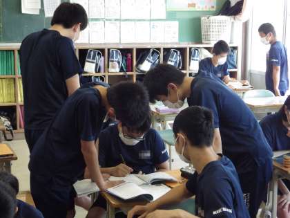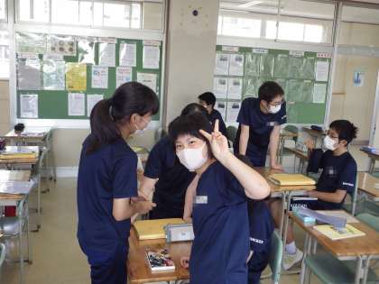 各教室では、一緒に学習したり、お話をしたり、思い思いに充実した昼休みを過ごしています。また、生徒会室前では、生徒会役員が行事の反省などを話し合っていました。カメラを向けると、気さくに応じてくれました。