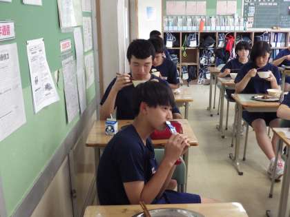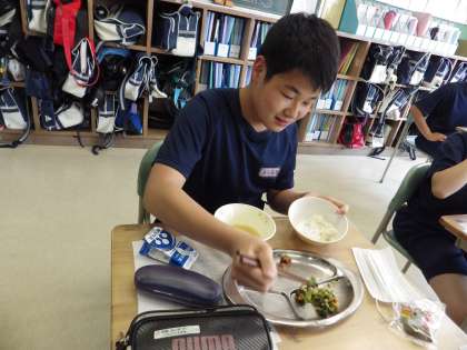 3年2組の給食の様子です。今日の献立は、麦ごはん・牛乳・かつおの味噌和え・おかか和え・わかめと豆腐の味噌汁・柏餅です。男子生徒に質問してみると、「やっぱりごはんが一番おいしいです。」とのことでした。毎日おいしく食べており、「いつまでもこの味が続くといいです。」とさわやかに答えてくれました。