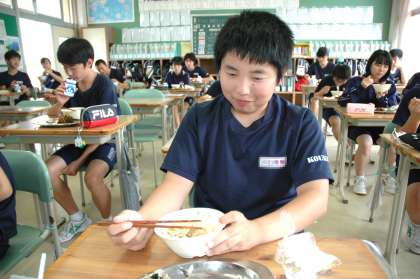 今日の献立は、きつねうどん・牛乳・大学かぼちゃ・ひじきともやしの和え物です。3年4組の男子生徒に聞いてみると、「うどんがさっぱりしていてとてもおいしいです。」とのことです。麺類の中でもうどんが一番好きであり、しかも細麺が好みなので、とてもおいしそうに食べていました。