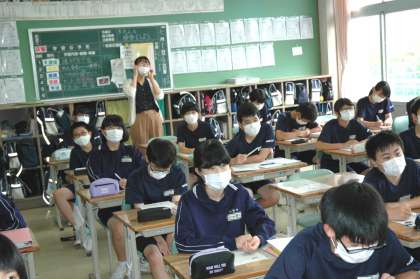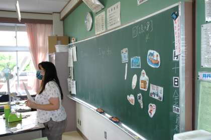 2年4組の英語の授業です。例を元に英文を作る学習をしています。自由に作ってよいのでみんなどのように作るか意欲的に考えています。なぜか例から発展して、メキシコの伝統的な料理の話で大変盛り上がりました。