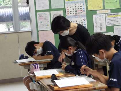 2年2組の数学の授業です。連立方程式の利用の仕方を学習しています。指名された生徒が堂々と板書しています。