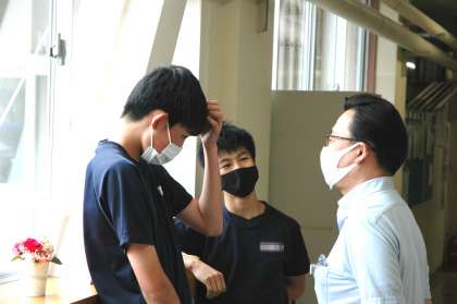 憲法第9条を暗記した生徒を、社会科担当が確認しています。すらすら言えなかったところは即時確認しています。