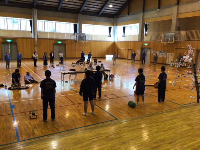 中田地区民生委員の方々が学校を訪問しました。歌舞伎学習の時間でしたので、三味線コース、役者コース、化粧コースの順で子どもたちの活動の様子を見ていただきました。その後、民生委員の方々と懇談しました。