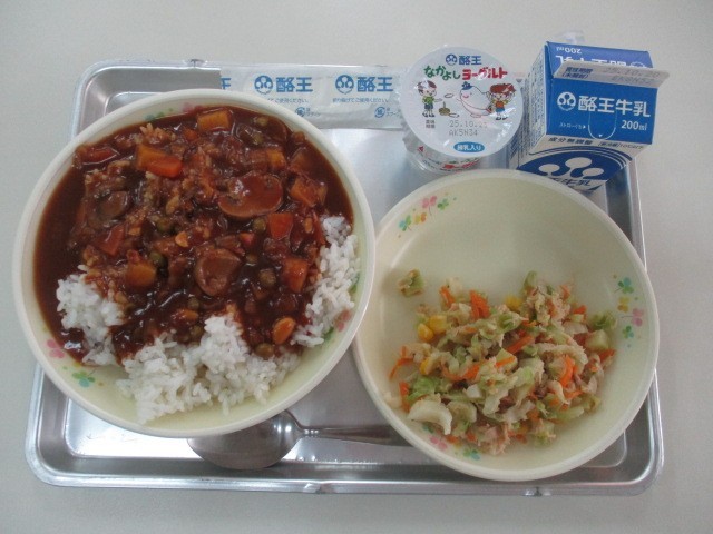 今日の給食の献立は、ハヤシライス、牛乳、フレンチサラダ、ヨーグルトです。今日のメイン「ハヤシライス」は、その名前から海外の料理だと思われがちですが、実は日本で生まれた「洋食」の代表的なメニューの一つです。給食室では、豚肉と玉ねぎを時間をかけてじっくり炒め、デミグラスソースやトマトなどの調味料を加えて丁寧に煮込みました。そのコク深い味わいを、フレンチサラダと一緒においしくいただきました。ごちそうさまでした。