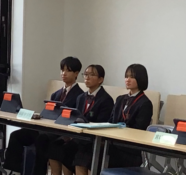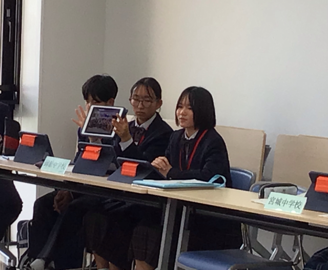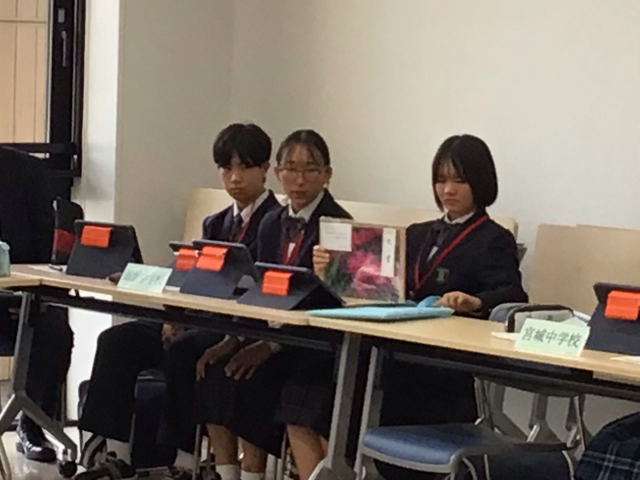 標記交歓会が、中央公民館を会場に開催され、本校からは3人が参加しました。全体会開会式の後、グループ別に協議しました。テーマは、「全校生を巻き込んだ生徒会活動にするために何ができるか」でした。本校は、みたて祭の取組を例に、歌舞伎学習の発表の様子タブレットの画像やフォトコンテストの写真を提示するなどして、堂々と発表することができました。