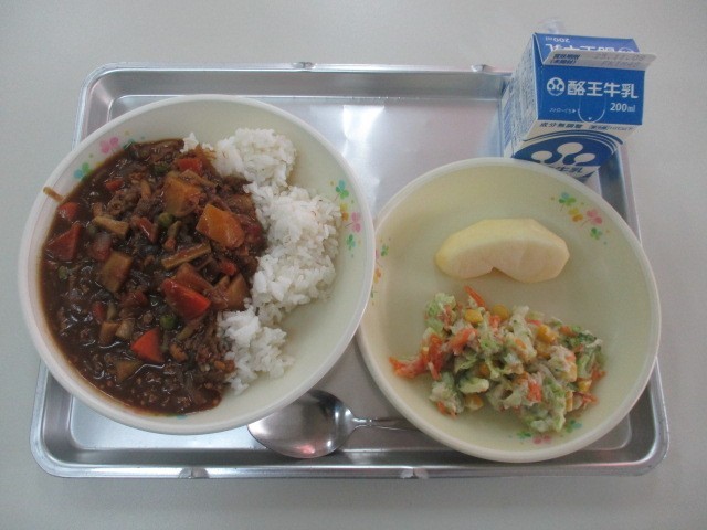 今日の給食は、「旬を食べよう!献立:きのこ・りんご」です。メニューは、ひき肉ときのこのカレーライス、牛乳、コールスロー、りんごです。