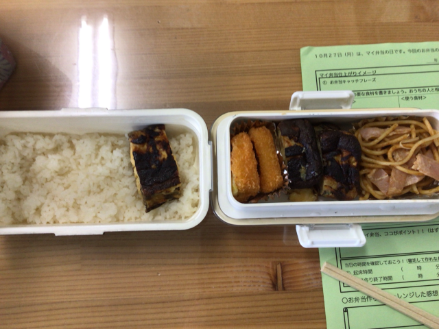 10月27日(月)は、全校で「マイ弁当の日」を実施しました。朝早く起きて自分で自分のお弁当を作ることに挑戦する日です。生徒たちはワークシートを参考に、彩りや栄養のバランスを真剣に考え、お弁当作りに励みました。自分で作ったお弁当を味わう時間を通して、食材を選ぶ大変さ、調理の難しさ、そして何より日頃食事を作ってくれる人への感謝の気持ちを改めて持つことができました。