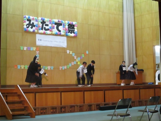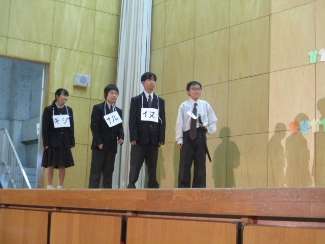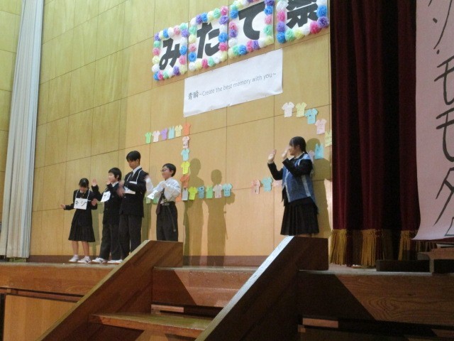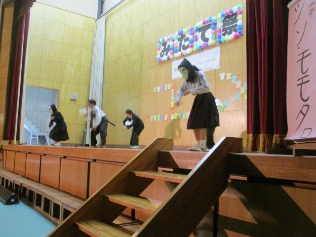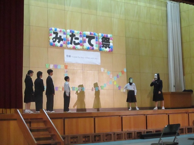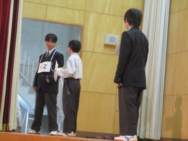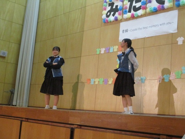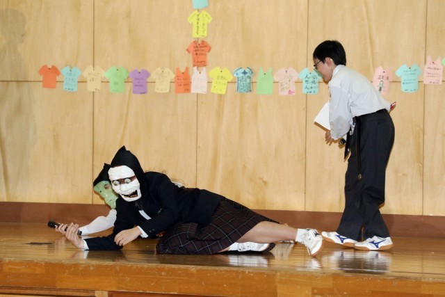 1年生による学年発表は、現代風にアレンジした「シン・モモタロ」です。舞台は2025年の現代です。おなじみの桃太郎の物語を、斬新な発想とコミカルな演技で展開しました。ユーモアあふれる脚本と、生徒たちの生き生きとした演技に、会場は大きな笑いと拍手に包まれました。