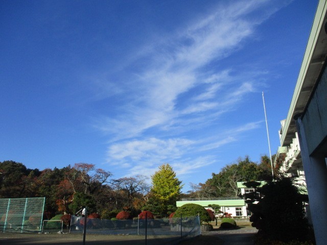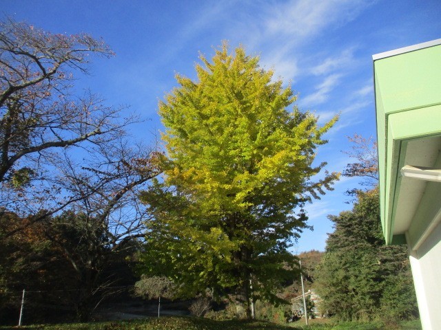 澄みわたる青空の下、校地内の銀杏の木が黄金色に輝いています。私たちはこの美しい景色の中で勉強や部活動に取り組んでいます。