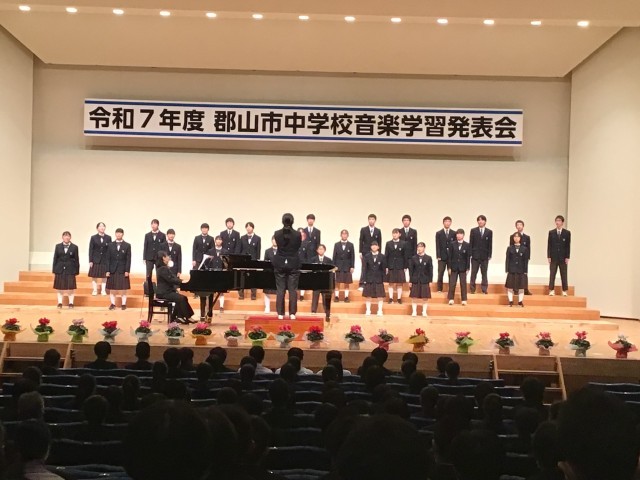 郡山市内の各中学校の代表生徒が集い、合唱等を披露する標記発表会が、けんしん郡山文化センターを会場に開催されました。短い時間の中で練習を積み重ねるとともに、パートごとによく意見を出し合い、よりよい合唱になるよう努力してきました。その成果を今日は、堂々と十二分に力を発揮しました。
