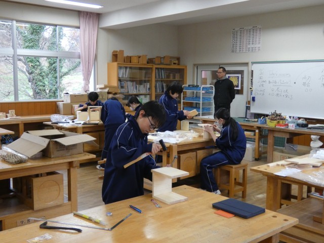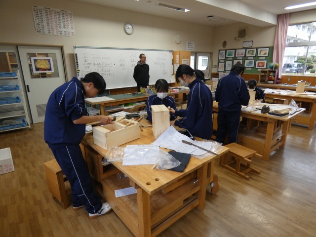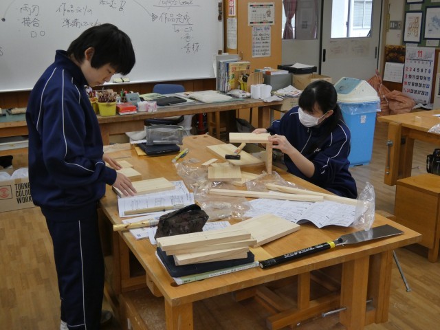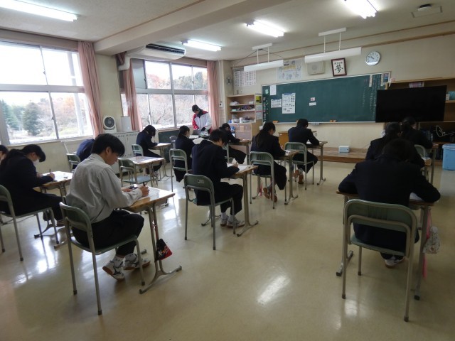 今日は、3年生は実力テストの日です。高校入試の出願準備が着々と進んでいます。実力テストに臨む3年生は真剣そのものです。1年生は木材加工、2年生は雲のでき方の学習中です。校舎内には、生徒作品が展示されています。授業参観で来校の折は、是非ご覧ください。