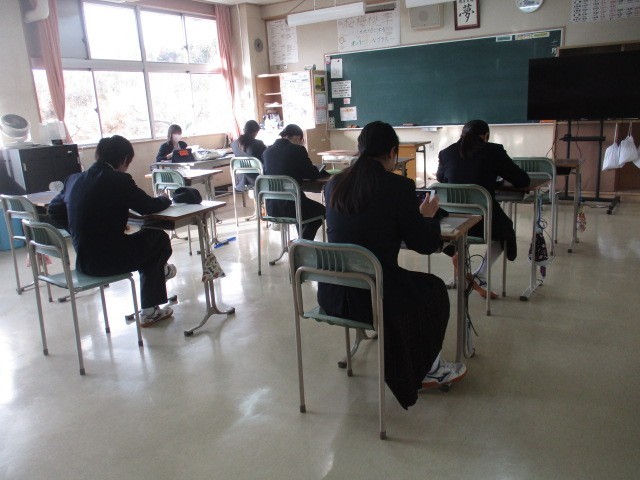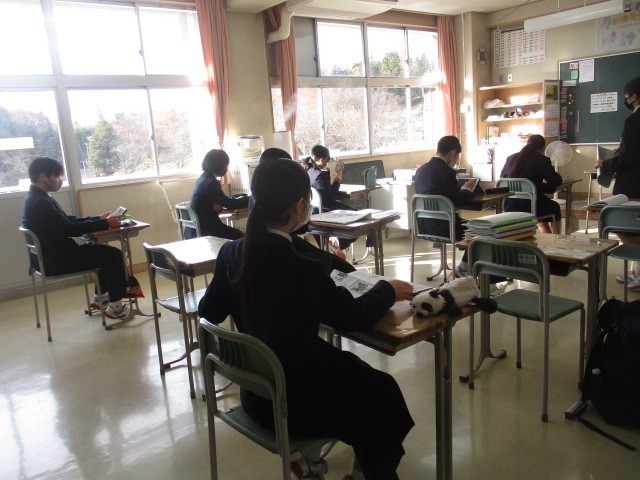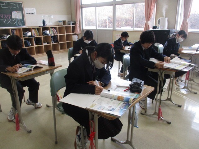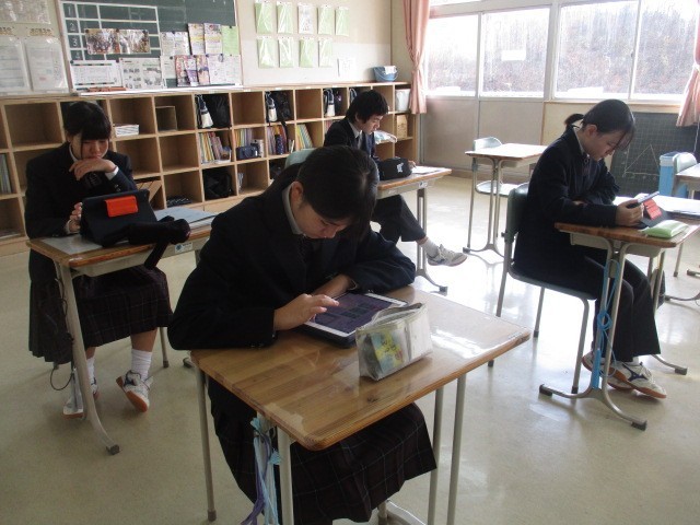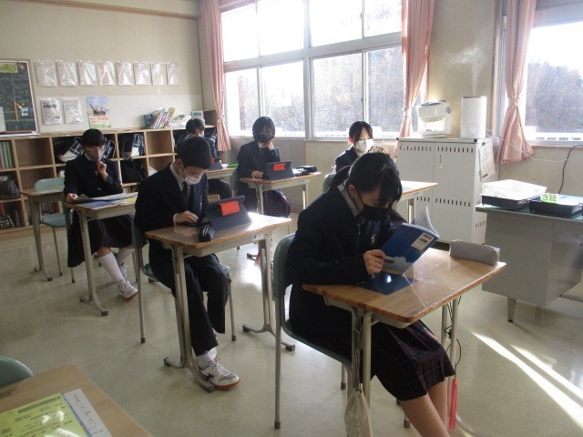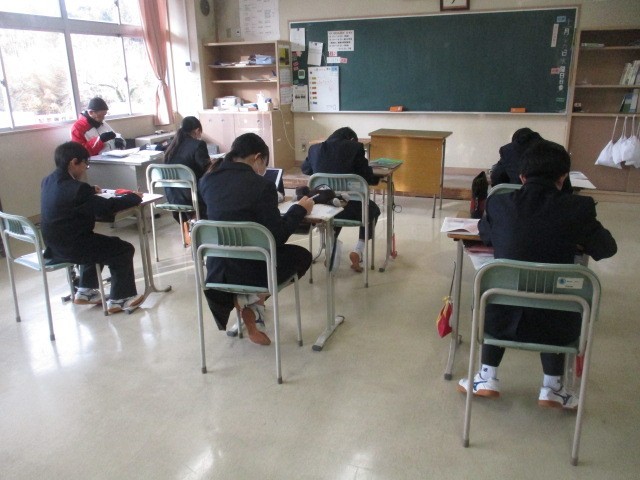 紅葉が一段落し、冬の気配が感じられる季節となりました。朝の時間を利用し、 1・2年生は明日の定期テストに向けて集中して勉強に取り組んでいます。3年生は日々のニュースに目を向け、タブレットで新聞を熱心に読み進めています。