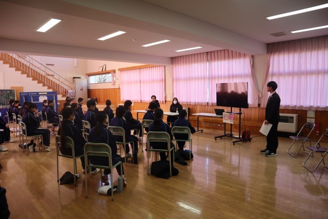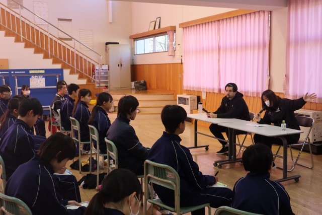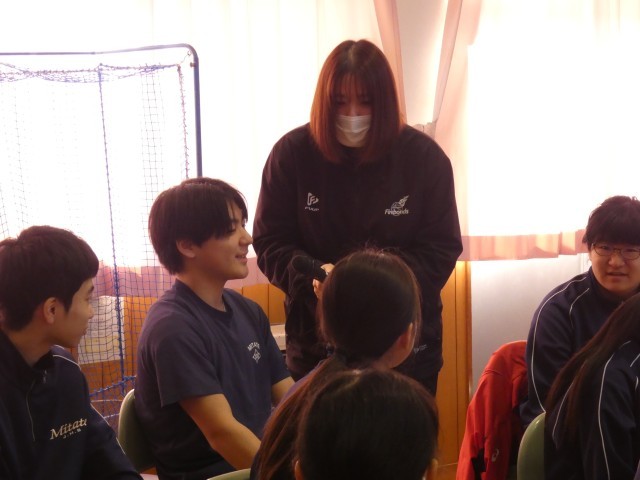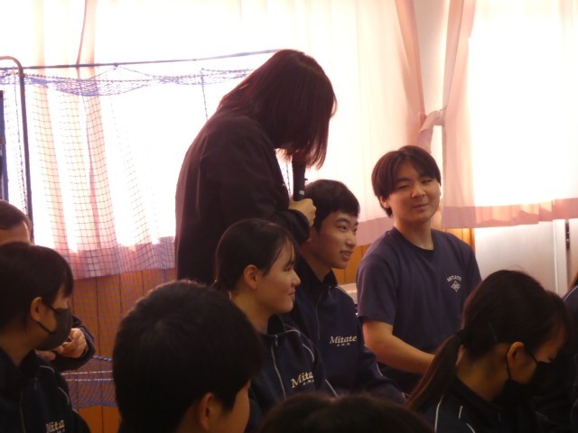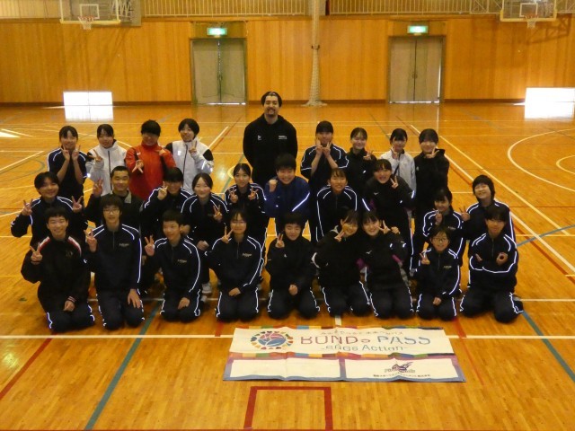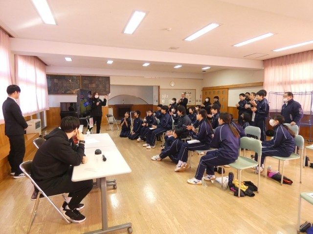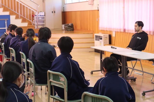 運動プログラム終了後、ワイリー選手と記念撮影です。後半の講話では、まずワイリー選手の試合での素晴らしい活躍を映像で拝見しました。その後、貴重なお話を伺いました。生徒たちは一言も聞き漏らさないよう、熱心にメモを取りながら、真剣な表情で耳を傾けていました。質疑応答の時間には、たくさんの質問が飛び出し、一つひとつ丁寧に答えていただきました。夢を持つことの素晴らしさや挑戦し続ける大切さはもちろん、日々のルーティン、一貫性を持って行動すること、そして食事や睡眠の大切さなど、一流の自己管理についても肌で感じることができました。