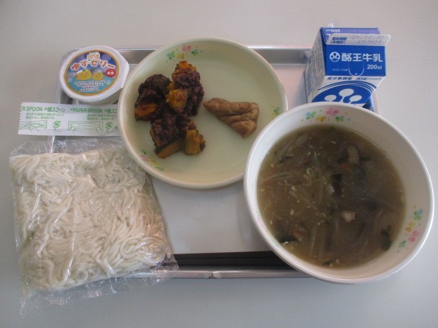 2学期最後の給食は、少し早い「冬至」にちなんだ行事食でした。献立は、もやしあんかけうどん、牛乳、三角油揚げの煮つけ、冬至かぼちゃ、ゆずゼリーです。一年で最も夜が長い冬至は、昔から「運気が下がり、体が弱る時期」と考えられてきました。そこで、保存性が高く栄養満点なかぼちゃを食べ、ゆず湯に入って厄を落とし、無病息災を願う風習が生まれました。今日の「冬至かぼちゃ」は、調理員さんが硬いかぼちゃを丁寧に切り、給食室で煮て作った手作りのあんこと合わせた特別な一品です。本日で今学期の給食も最後となります。冬休み中も生活リズムを整え、元気に3学期を迎えましょう。