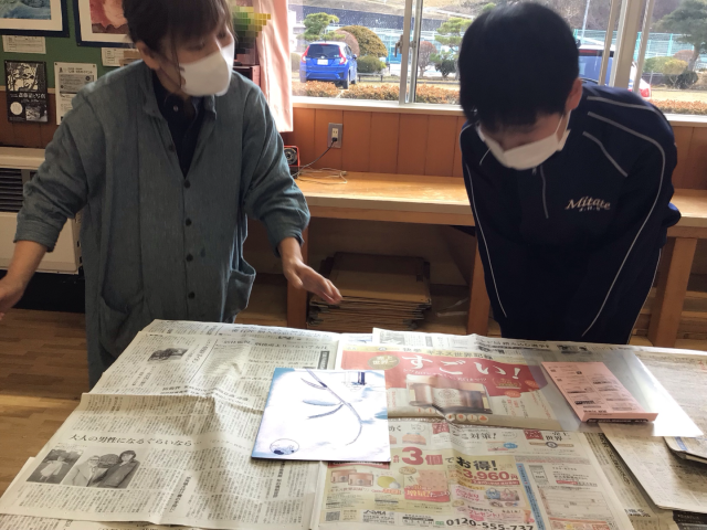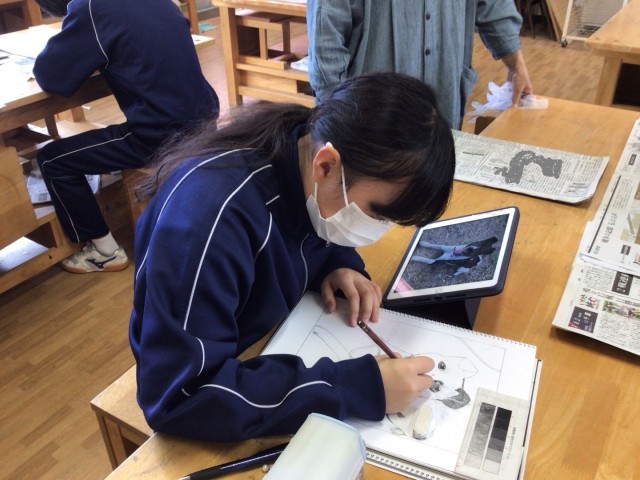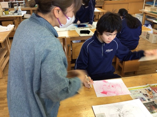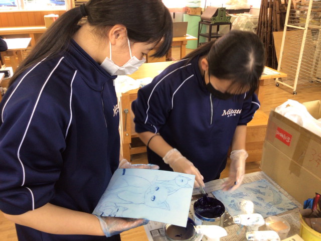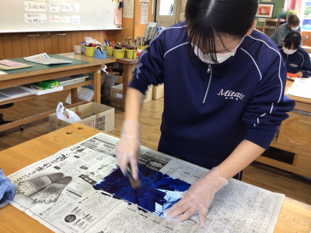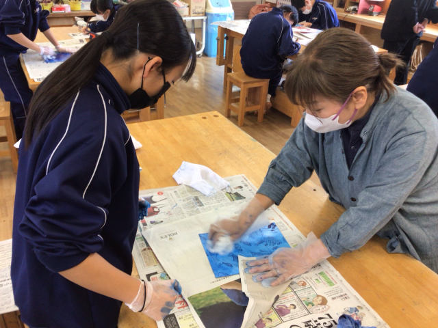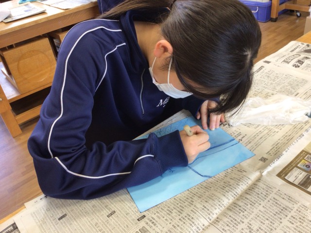 2年生の美術の授業は、ドライポイントの制作です。作品の仕上がりを左右する寒冷紗によるインクのふき取り作業を生徒たちは一つひとつの工程を大事に真剣な表情で取り組んでいました。