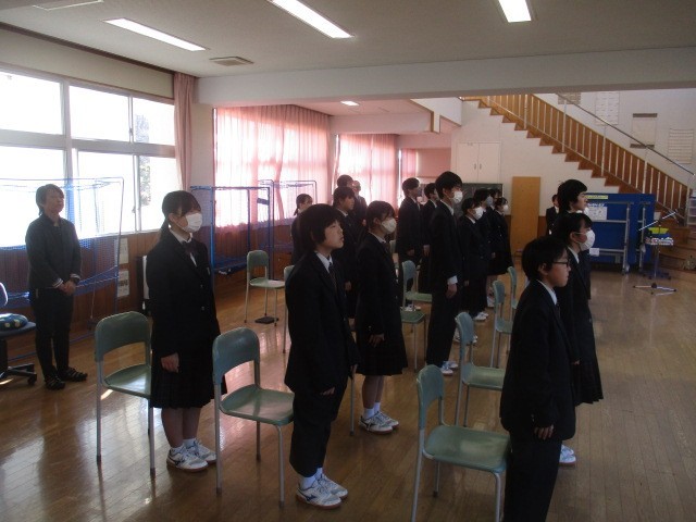 また、校歌斉唱では爽やかな歌声が響き渡りました。保護者の皆様、地域の皆様には、今学期も本校の教育活動に対し多大なるご理解とご協力をいただき、誠にありがとうございました。明日からは15日間の冬休みが始まります。健康と安全に気をつけ、充実した休みにしてほしいと思います。