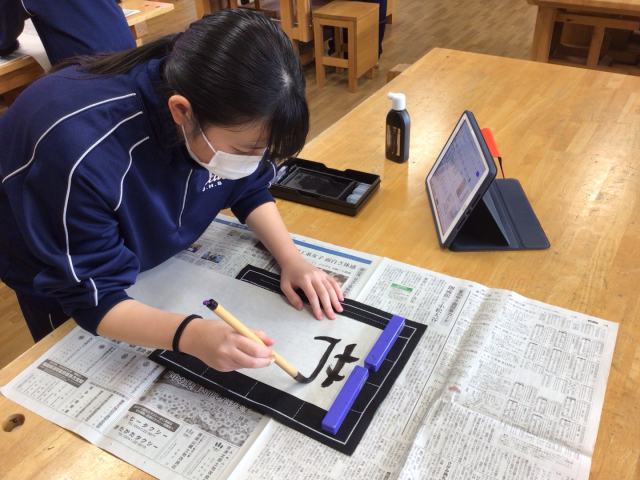 今回は、生徒一人ひとりが選んだ「自分のお気に入りの言葉」を練習し、作品に仕上げました。筆先に集中し、文字の形やバランスを考えながら、思い思いの言葉を力強く書き上げていました。1年生の書道の様子です。
