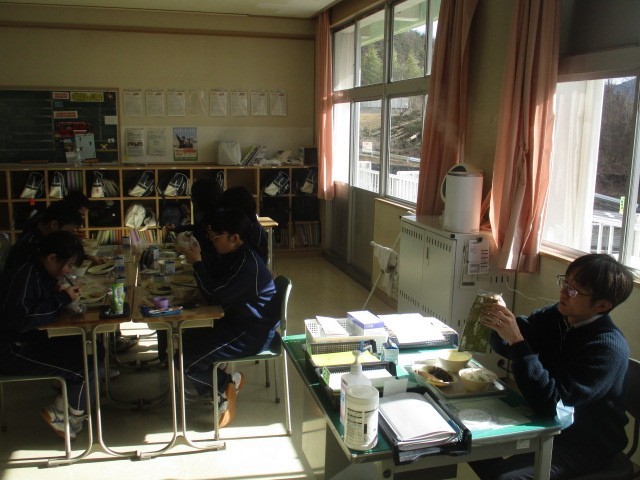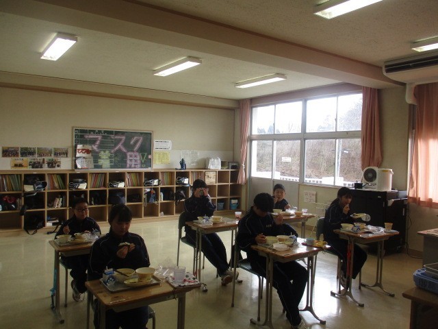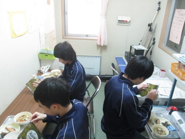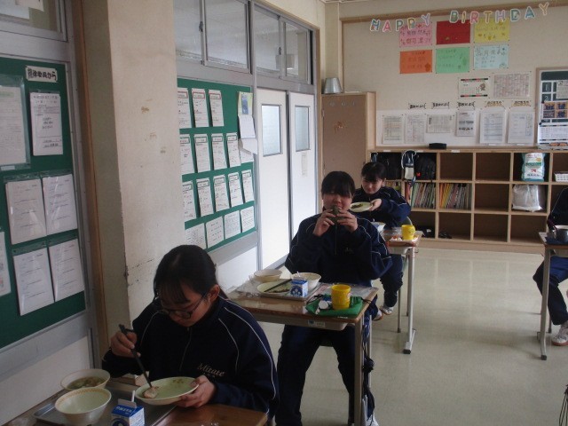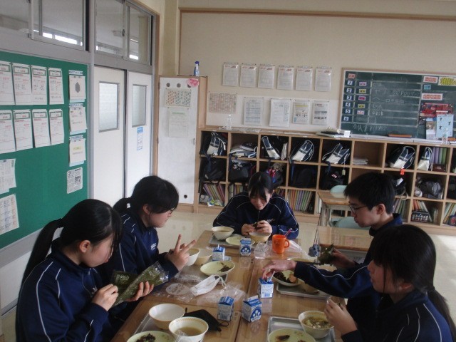 今日の給食は「学校給食週間」にちなみ、給食が始まった当時のメニューを再現・アレンジした「給食始まりの献立」でした。メニューは、セルフおにぎり、牛乳、塩さけ、ひじきの炒め煮、曲がりねぎと白菜のみそ汁でした。生徒たちは、塩さけを丁寧にほぐして具にしたり、ひじき煮をごはんに混ぜ込んだりと、工夫を凝らして自分だけのおにぎりを作っていました。今日もおいしい給食ごちそうさまでした。
