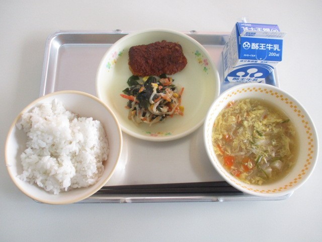 今日の献立は、麦ごはん、牛乳、かつおカツ、もやしとわかめのピリ辛和え、えのきだけのかきたま汁です。えのきだけには、疲労回復に効果のあるビタミンB1や食物繊維をはじめ、鉄分、カリウム、ギャバなど、体に嬉しい栄養素が豊富に含まれています。ふわりとした食感のかきたま汁には、栄養満点のえのきだけがたっぷり使われていました。今日もおいしい給食ごちそうさまでした。