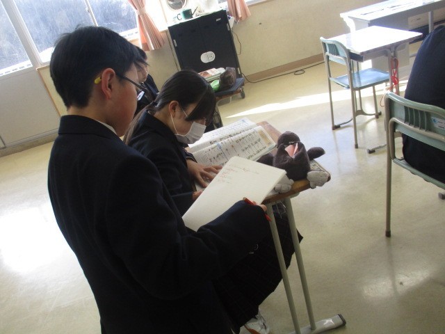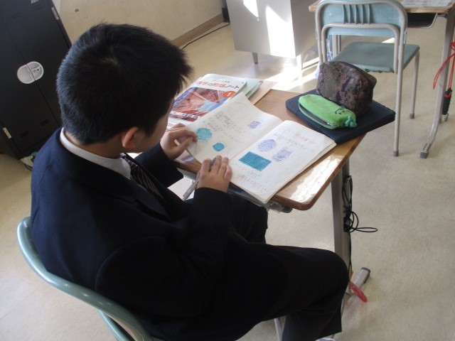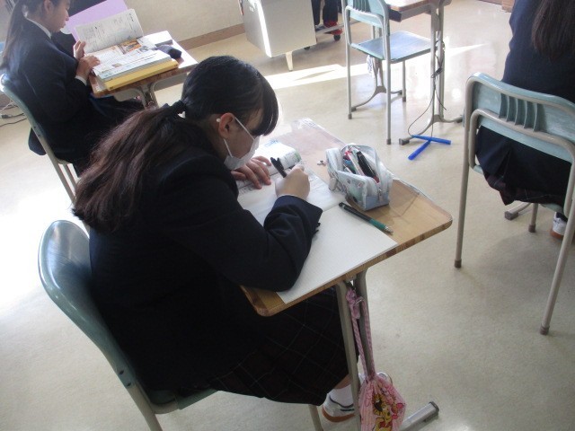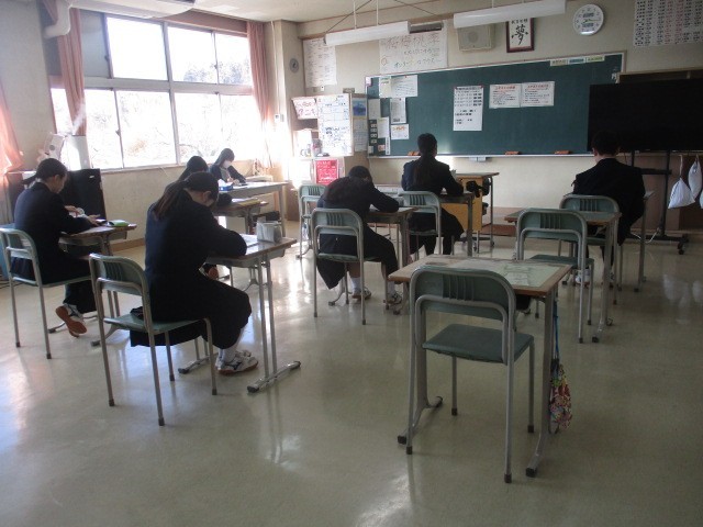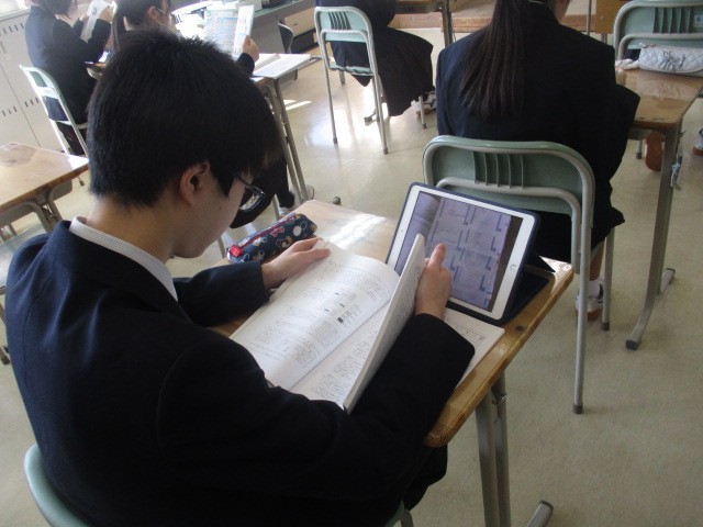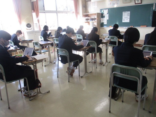 鮮やかな青空が広がっています。今日は全学年でテストが行われます。教室では生徒たちがタブレットや教科書を手に真剣な表情でテスト対策をしています。