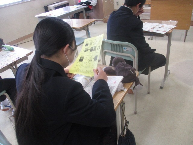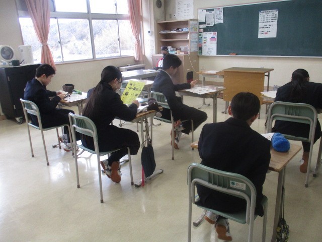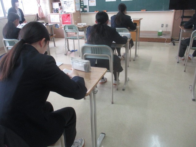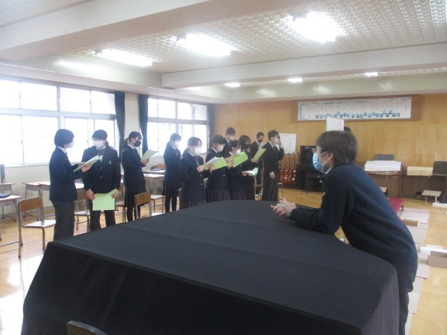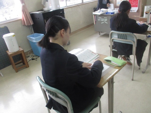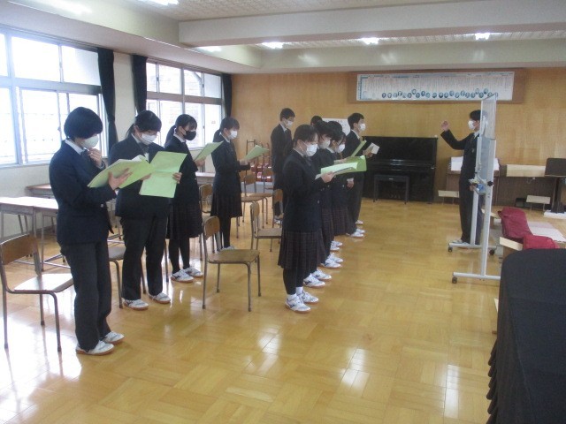 本日1・2年生は定期テスト2日目です。朝の貴重な時間、1分1秒を惜しむように集中してテストの最終確認に取り組む姿が見られます。一方、3年生は音楽室に集まり、卒業式に向けた式歌練習を行っています。