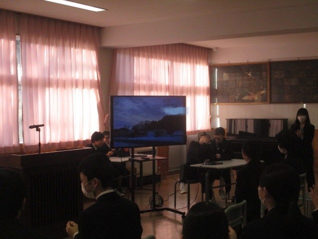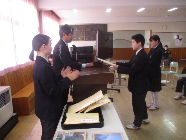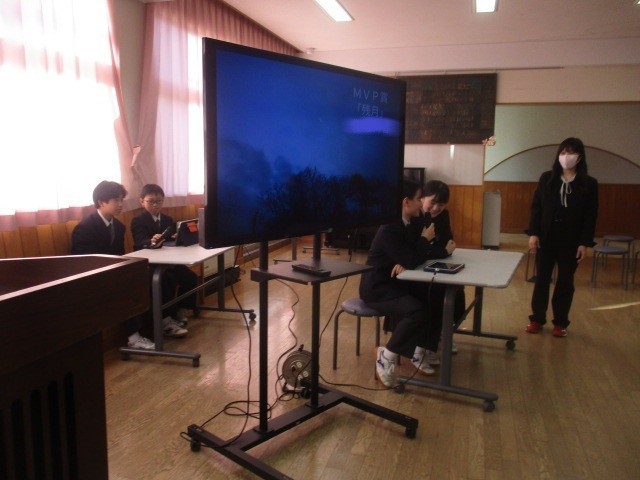 生徒総会後、生徒会本部より「令和7年度 冬のフォトコンテスト」の受賞作品が発表されました。今回見事MVP賞に輝いたのは作品「残月」です。他にも、金賞「雪景色」、銀賞「冬の空」、銅賞「吹雪と光り」、生徒会賞「冬の看板娘」、ファンタジーで賞「御舘の森ジブリ美術館」など、モニターに映し出された美しい景色に、会場からは大きな拍手が送られました。受賞したみなさん、本当におめでとうございます!