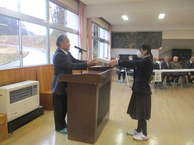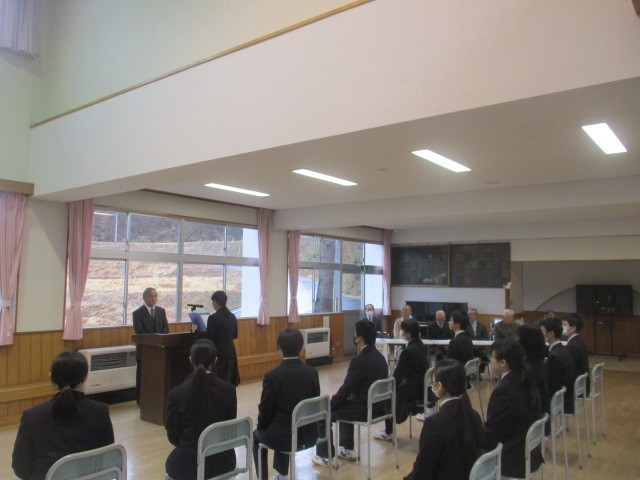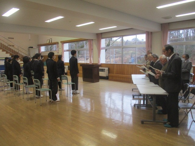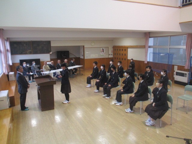 記念品の授与、誓いのことば、校歌斉唱の様子です。お忙しい中ご臨席賜りました役員の皆様、誠にありがとうございました。歴史ある同窓会の一員として、生徒たちを温かく迎え入れていただいたことに深く感謝いたします。