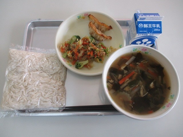 今日の献立は、わかめうどん、牛乳、揚げぎょうざ、白菜のナムルです。うどんは喉ごしが良く、消化にも優れているため、食欲が落ちる夏や体が冷える冬にもぴったりの食べ物です。ただし、汁をすべて飲み干すと塩分のとりすぎになってしまうことがあります。ご家庭やお店で食べる際は、汁を残したり他のおかずの塩分を控えたりする工夫が大切です。給食では塩分がちょうど良く調整されているので、安心しておいしくいただきました。今日もおいしい給食ごちそうさまでした。