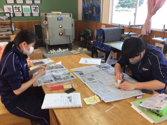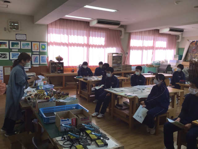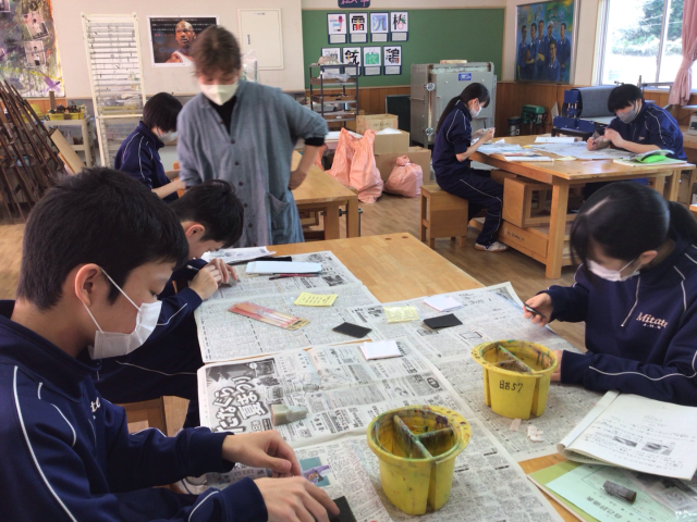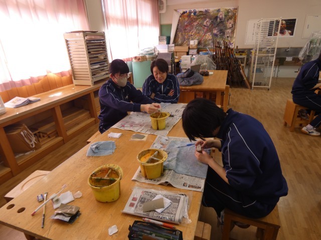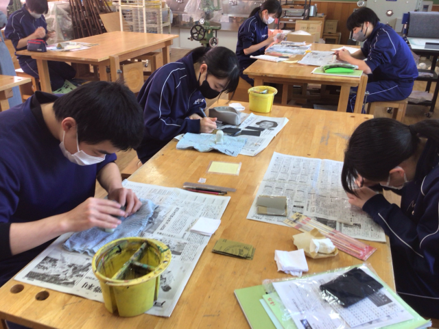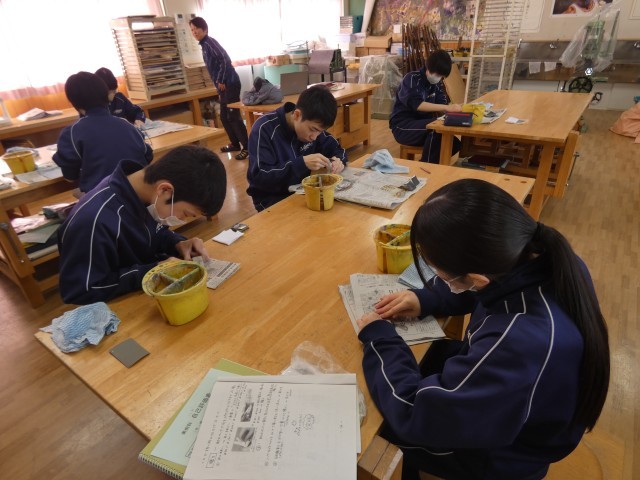 本日1・2校時、3年生が「中学校生活最後の美術」に臨みました。最後を締めくくるのは「てん刻」の制作です。これまでの感謝を込めるように、耐水ペーパーで時間をかけてじっくりと、つるつる・ピカピカになるまで磨き上げました。粉を洗い流し、磨き剤で丁寧に磨き込み、最後に布で拭き上げると、石はまばゆい輝きを放ちました。その輝きは、3年間の努力の結晶のようでもありました。3年生の皆さん、お疲れ様でした。