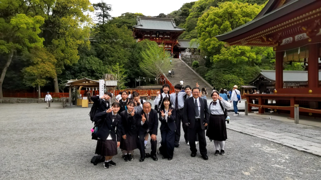 鎌倉到着です。鶴岡八幡宮で集合写真を撮りました。