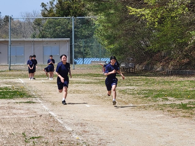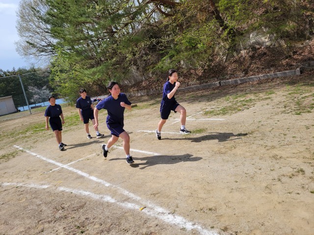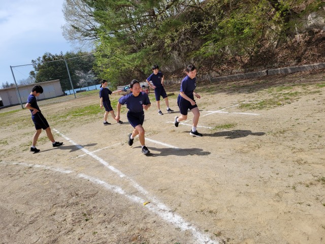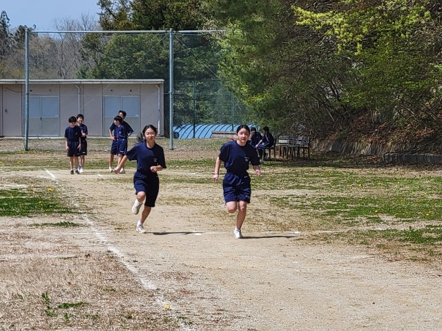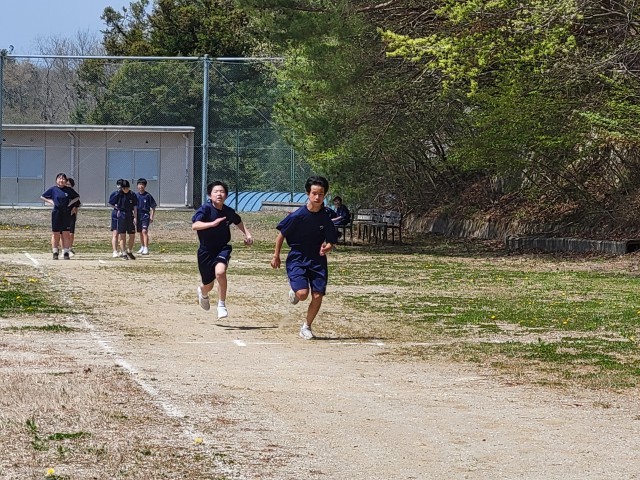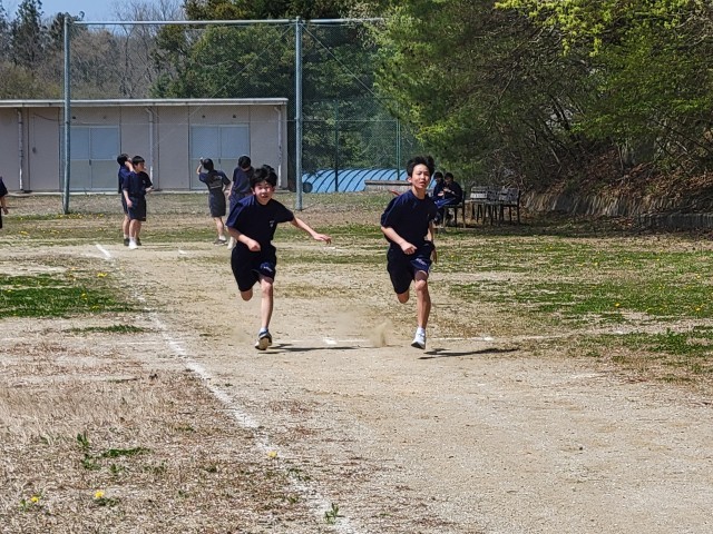 保健体育では全学年「陸上競技」の単元で短距離走に取り組んでいます。生徒たちは少しでもタイムを縮めようと、自分に合ったピッチとストライドを意識しながら全力で校庭を駆け抜けています。互いに競い合う楽しさを味わいながら、自己ベストの更新を目指して元気に活動しています。