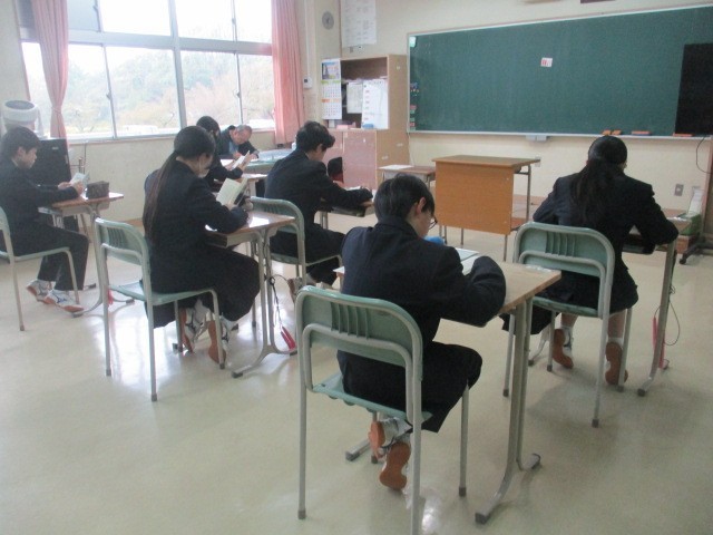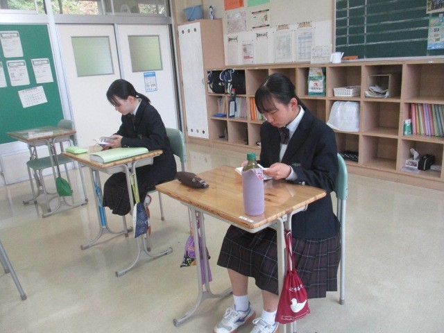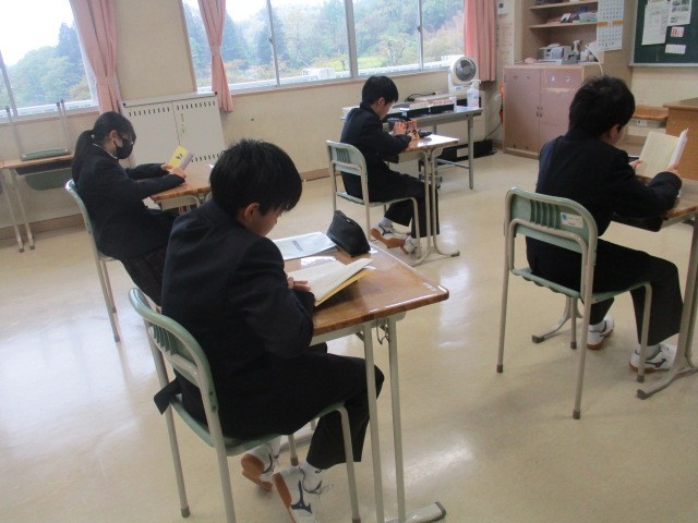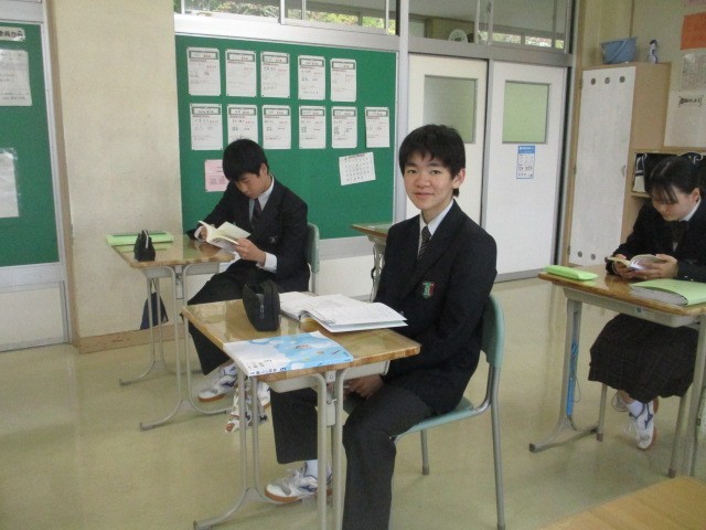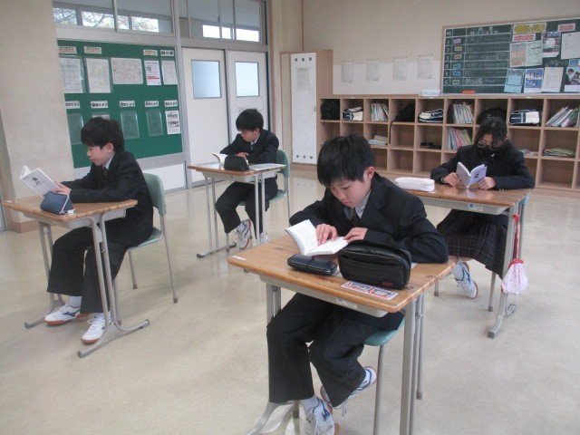 月曜日の朝は読書の時間です。集中して本に向き合う生徒たちの姿が見られます。校舎北側の花壇では、黄色や紫、白のパンジーがきれいに咲いています。