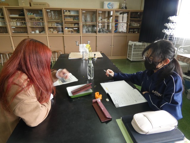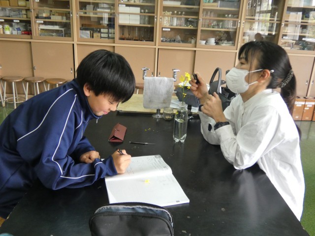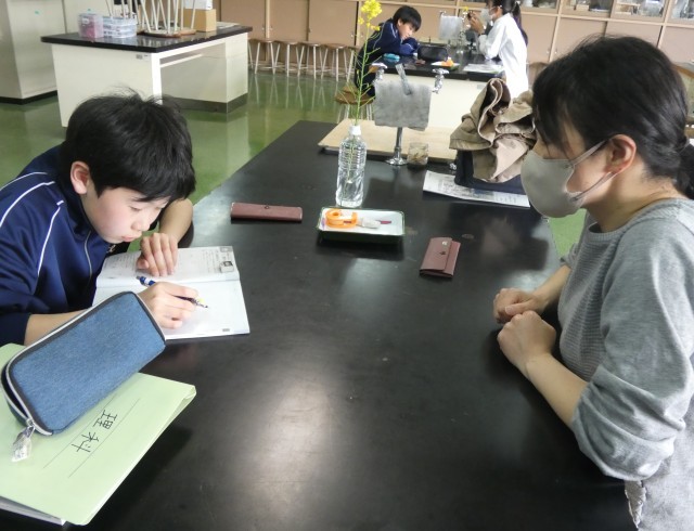 本日は授業参観です。1年生の理科の授業では「花のつくり」を学習しました。お母さんとペアになり、ルーペやピンセットを器用に使って花の細部を観察しました。普段は意識して見ることのない花びらや花粉の様子を親子でじっくりと観察し、驚きや発見のある充実した時間となりました。