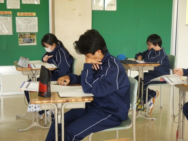 2年生の英語の授業では、未来形の学習をしました。未来形を使った文章の読み取りと、本文の内容についての質問に答えました。多くの生徒が積極的に挙手をして発言する姿が見られ、教室は活気に満ちていました。学んだ表現を使って、自分の将来についても英語で伝えられるよう練習を重ねていきます。