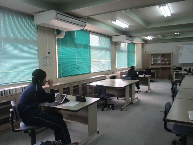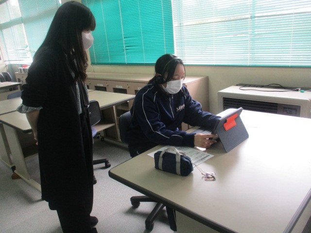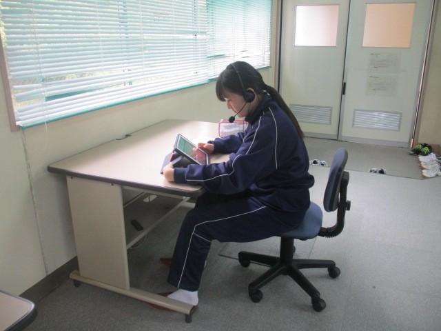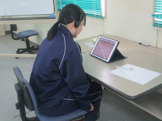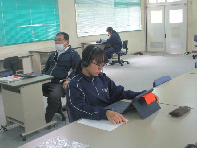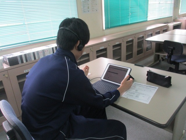 4月30日(木)、3年生が「全国学力・学習状況調査」の英語「話すこと」テストに臨みました。一人ひとりがヘッドセットを使い、タブレット端末を通じて英語で答えるCBT形式のテストです。生徒たちは先生の説明をしっかりと聞き、画面から流れる音声に集中し、マイクに向かって一生懸命に英語で答えていました。