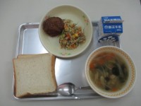 今日の給食は、山菜うどん、牛乳、味付いなり、小松菜とキャベツの和え物です。
