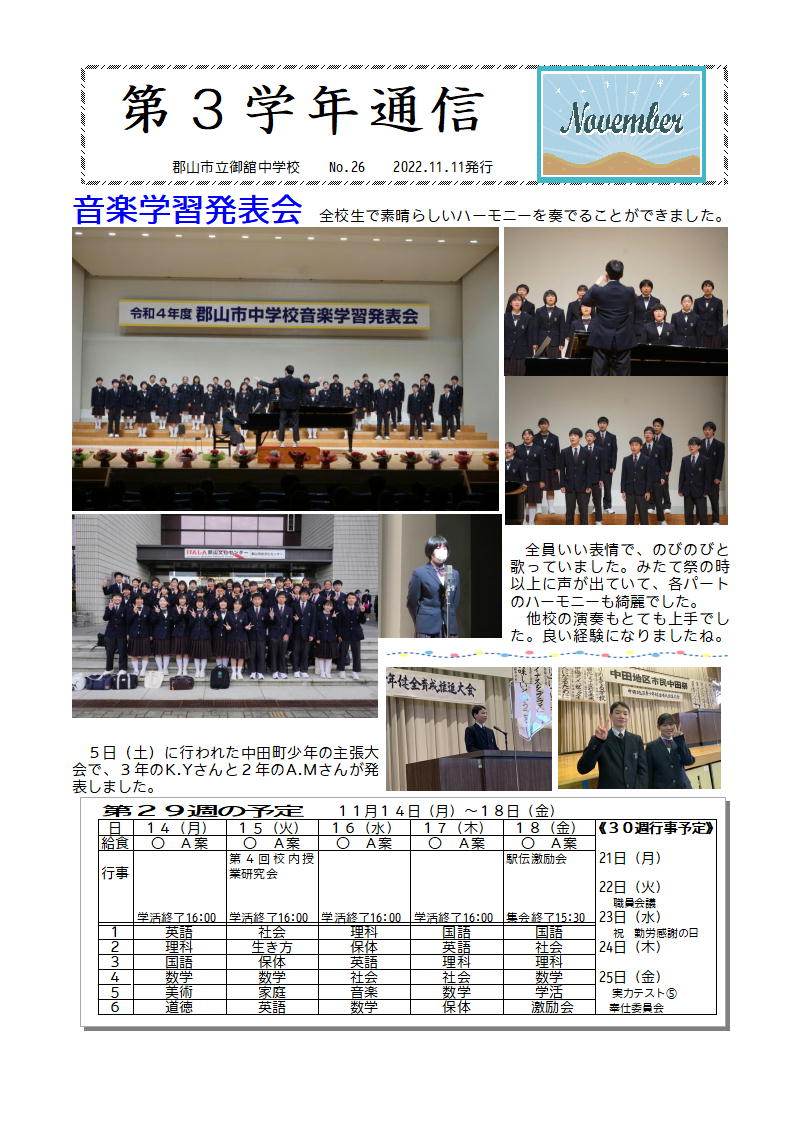 先週は、全校で参加した音楽学習発表会、2年生の職場体験が無事に実施でき、大変嬉しく思います。